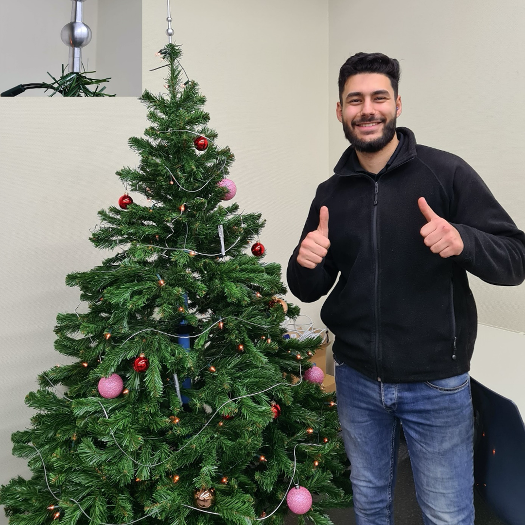 Op de foto zien we onze leerling Ramazan die dit jaar de piek voor de kerstboom heeft gedraaid en de slingers heeft gemaakt van mooie lange aluminium lintspanen.